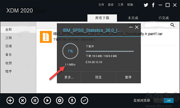 5、在國外一些冷門的資源下載地址測試,XDM2020下載速度平均穩(wěn)定在1MB/s左右;