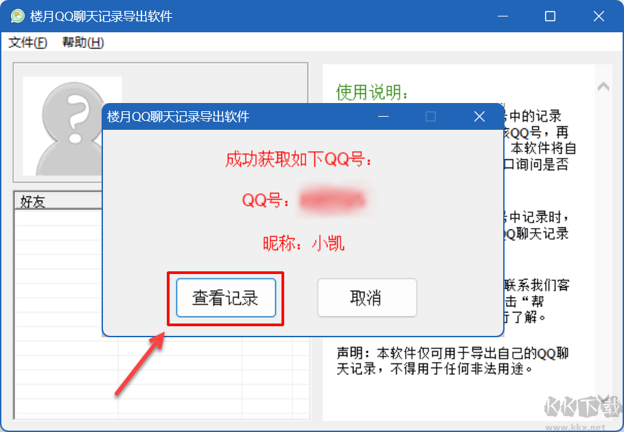 2,電腦版QQ不要退出登錄,運行樓月QQ聊天記錄導(dǎo)出軟件,單擊彈出對話框上的“查看記錄”按鈕。