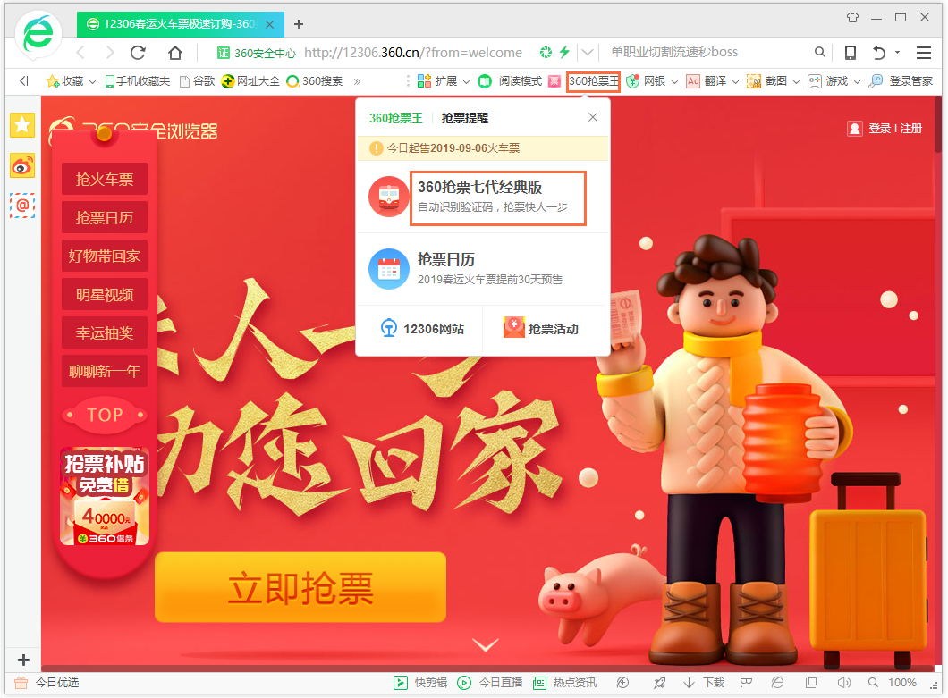 安裝成功,打開(kāi)360瀏覽器,在上方點(diǎn)擊【360搶票王】,選擇【360搶票七代經(jīng)典版】。