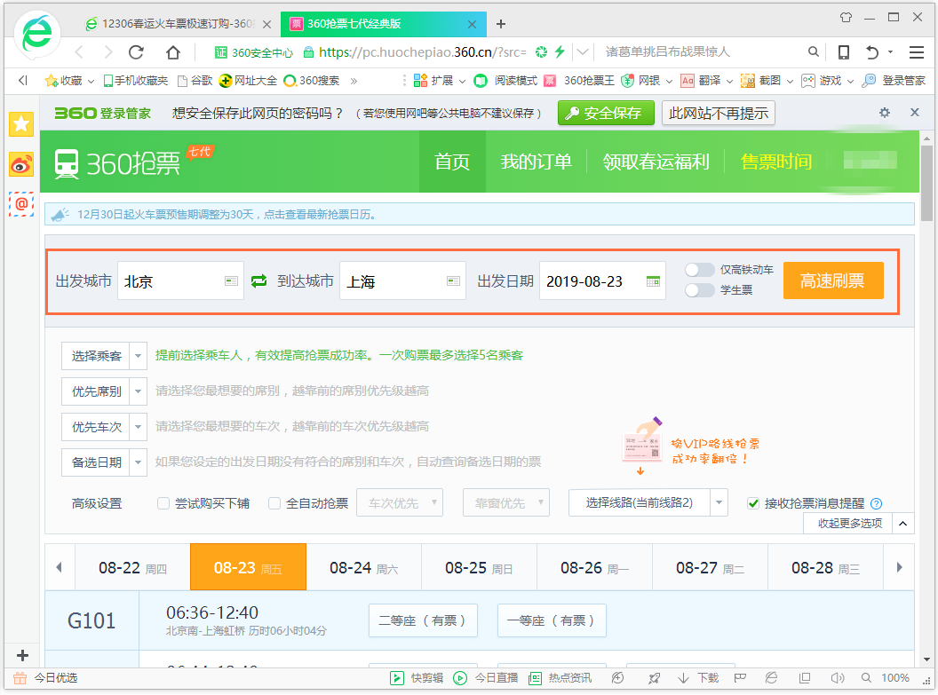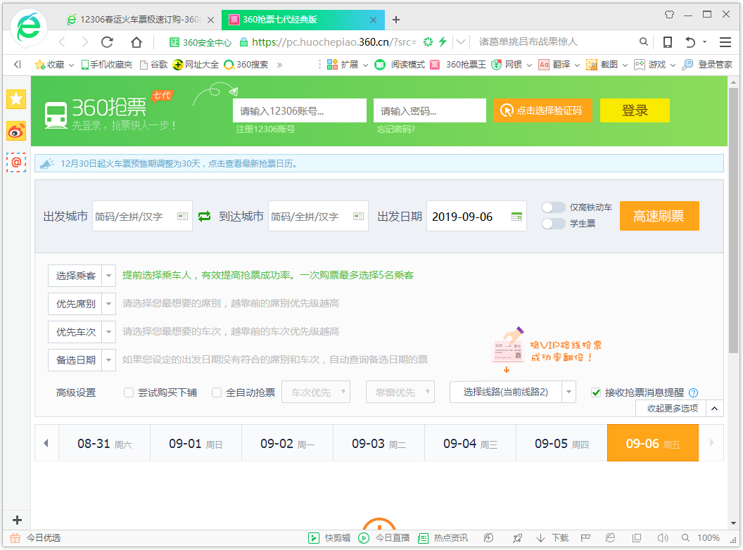 在節(jié)日期間登陸12306.com很難知道,用戶(hù)經(jīng)常因?yàn)椴荒艿卿?,登錄超時(shí),甚至掉線等與返鄉(xiāng)車(chē)票失之交臂。360霸王可設(shè)置“自動(dòng)登錄”,一次填寫(xiě),下一次直接點(diǎn)擊“火車(chē)票刷票機(jī)”即可登錄進(jìn)入預(yù)訂頁(yè)面,成為春運(yùn)搶票的贏家。