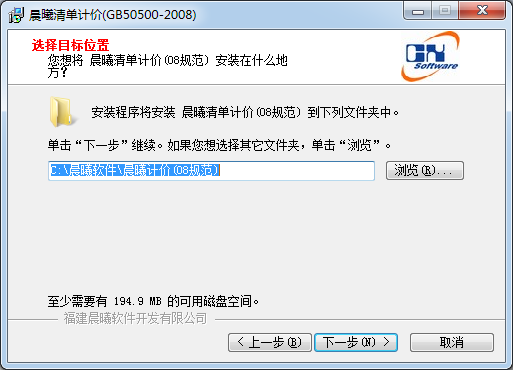 安裝程序?qū)惭b晨曦清單計價(08規(guī)范)到下列文件夾中。單擊“下一步”繼續(xù)。如果您想選擇其它文件夾,單擊“瀏覽”。