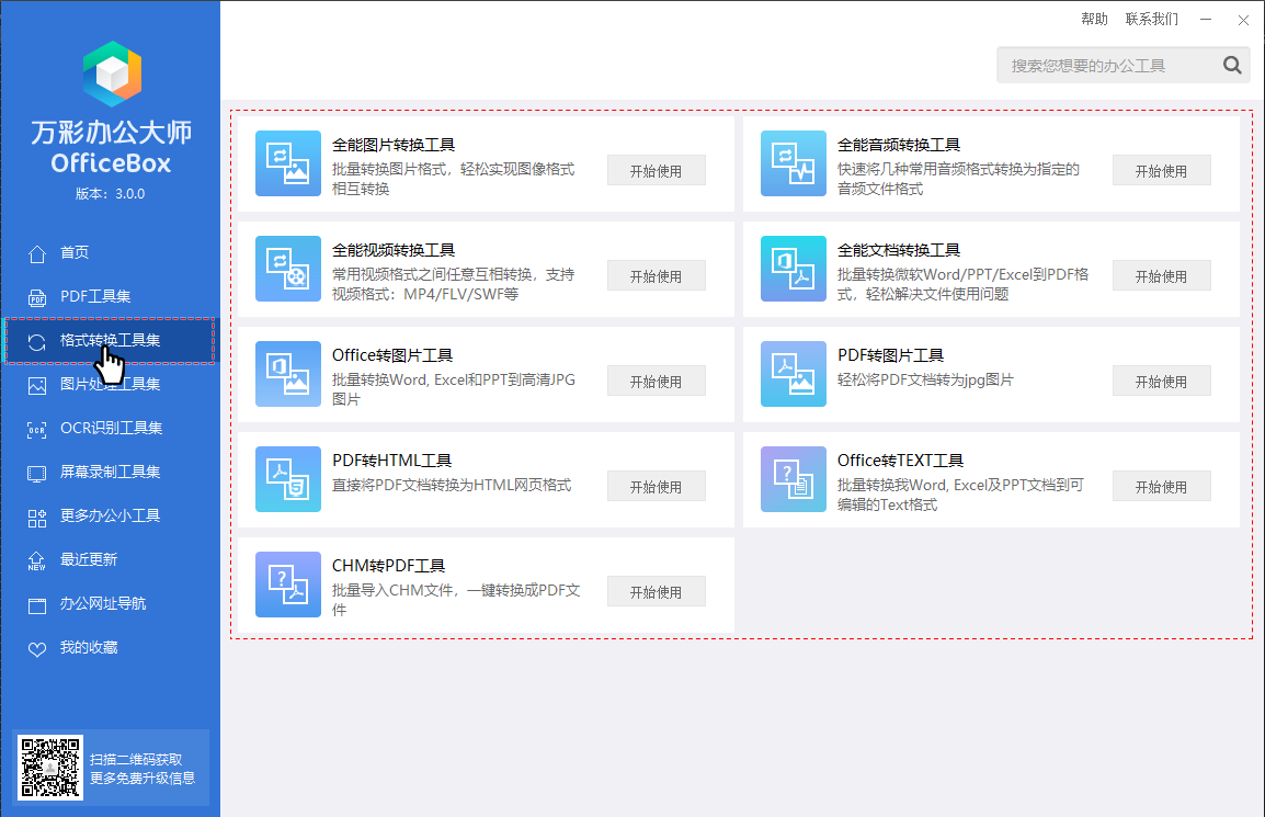 包括全能PDF轉(zhuǎn)換器 (轉(zhuǎn)圖片,轉(zhuǎn)WORD,轉(zhuǎn)HTML),Office轉(zhuǎn)換器(WORDPPTEXCEL轉(zhuǎn)圖片及PDF),全能圖片轉(zhuǎn)換工具,全能音頻轉(zhuǎn)換工具,全能視頻轉(zhuǎn)換工具, 全部支持批量轉(zhuǎn)換。