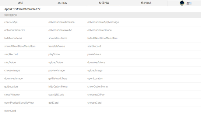 在“權(quán)限列表” Tab 中,可以查詢到當前頁面擁有權(quán)限的 JS-SDK 列表: