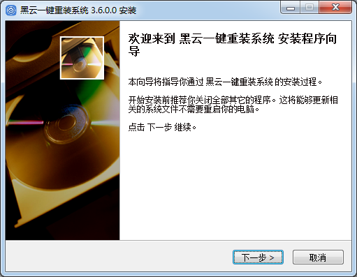 1.將kkx分享的壓縮包解壓出來得到程序安裝包,雙擊打開【黑云一鍵重裝系統(tǒng)3.6.0.0安裝】開始安裝,點(diǎn)擊下一步繼續(xù)安裝;