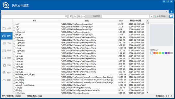 快眼搜索軟件是一款超強的文件搜索工具,支持電腦本地文件的搜索,支持搜索電腦中的磁盤目錄、圖片、文檔、視頻、音頻、壓縮文件、程序等所有的東西只要你電腦中有的你輸入對應的文件名就可以搜到??煅?,性能如其名一樣的迅速,支持通配符模糊查詢、多種過濾方式、多種排序方式,感覺Windows自帶的搜索功能太慢,太拖拉那么可以試試kkx分享的快眼文件搜索哦!