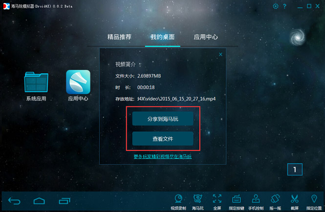 錄制結(jié)束后,跳轉(zhuǎn)到下方圖示的畫面。玩家可以選擇直接分享到海馬玩,或者查看已經(jīng)錄制好的視頻。