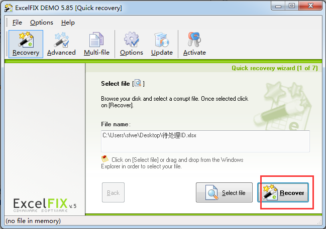 2、點(diǎn)擊selectfile按鈕,找到您要恢復(fù)的Excel文件,找到后點(diǎn)擊Recover按鈕。