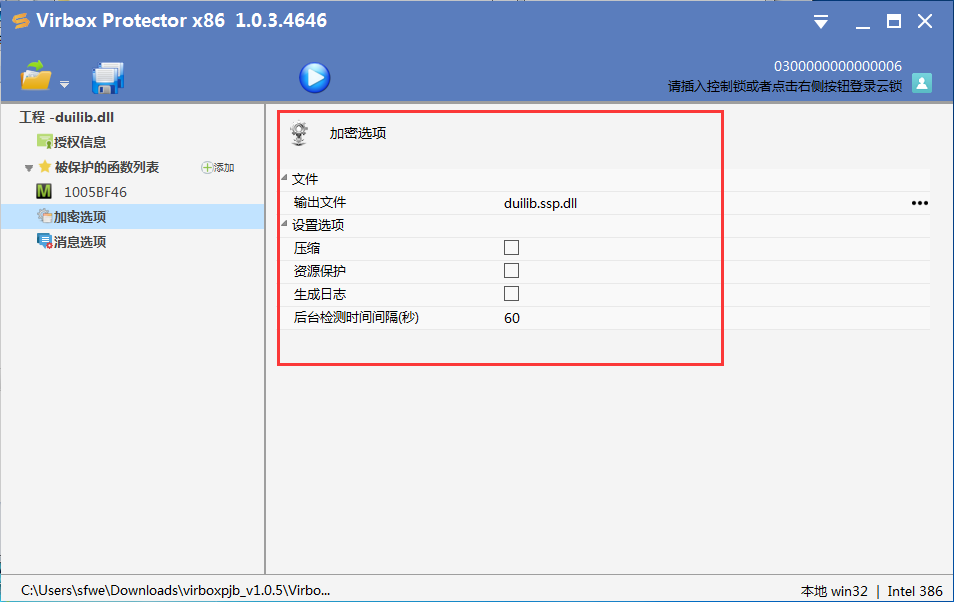 5.點擊加密選項,支持輸出文件、資源保護、生成日志、后臺檢測時間間隔秒,如下圖所示: