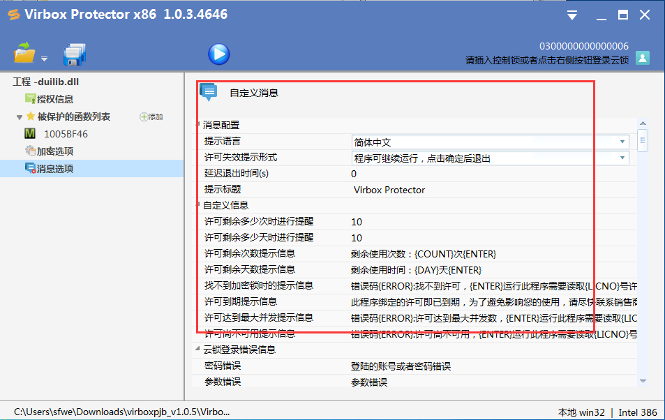 6.可以建立許可提示,已經(jīng)列出經(jīng)常使用的提示,包括許可剩余天數(shù)提示信息、找不到加密鎖時的提示信息