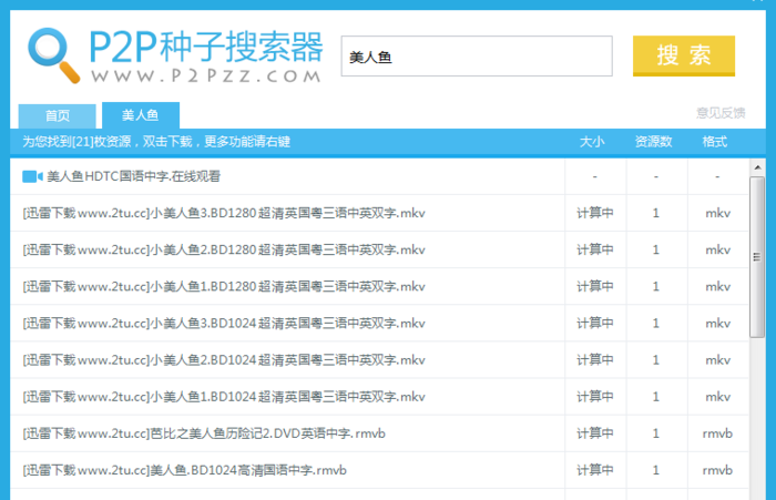 1、使用p2p種子搜索器下載版輸入想要看的視頻,例如“美人魚”,點擊“搜索”