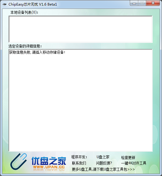 2、打開后可以看到顯示獲取信息失敗,因為小編的U盤并沒有插到電腦上,此時小編將U盤插入電腦,在u盤芯片檢測工具(ChipEasy)軟件界面就會顯示出U盤的纖細信息了!