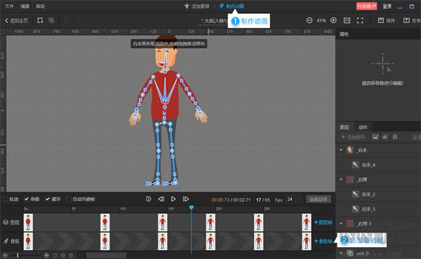 3、動(dòng)作編排:將預(yù)設(shè)動(dòng)作拖至?xí)r間軸,設(shè)定動(dòng)畫順序 。