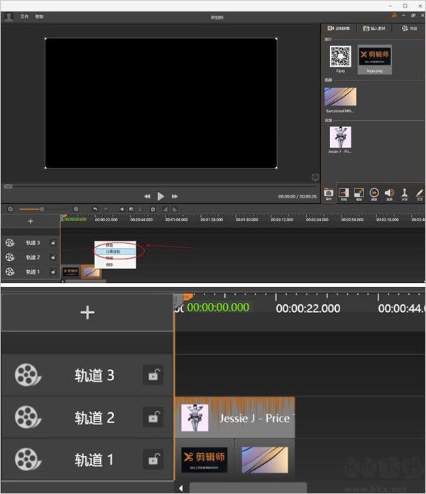 8、將素材添加到軌道 1,可添加起止圖片,右鍵分離音軌后拖至軌道 2 替換音頻。