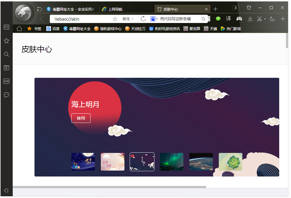 打開獵豹安全瀏覽器,進入界面,點擊右上方的【換膚】按鈕,