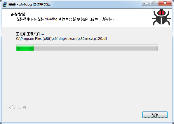 安裝程序正在安裝x64dbg簡體中文版到您的電腦中,請等待。
