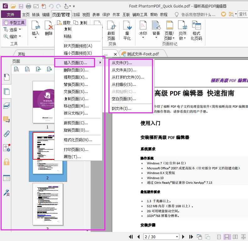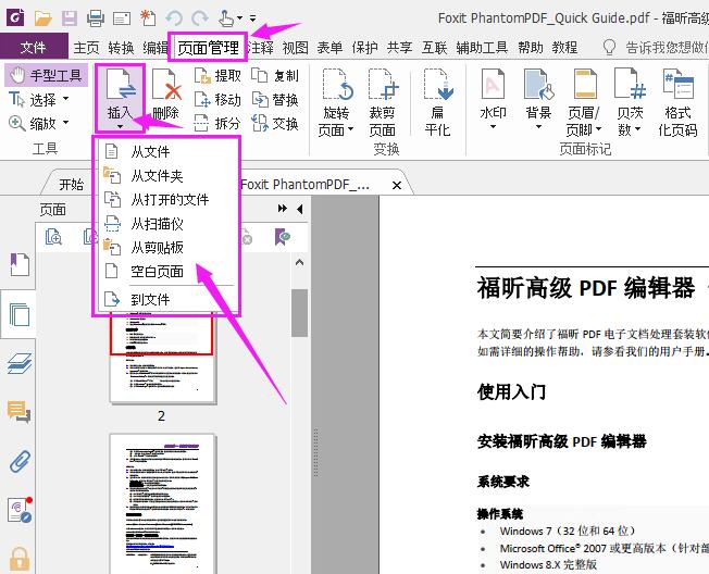 點(diǎn)擊頁(yè)面管理>插入,在列出的選項(xiàng)中選擇合適的一種進(jìn)行文檔合并