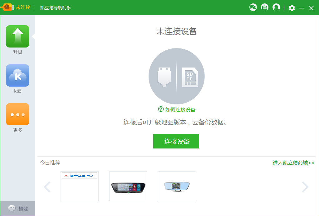 只需您將導航儀(或是是儲存卡)與電腦上連上,凱立德導航助手能夠自動檢索機器設(shè)備信息,智能化判斷升級版本號,省時、放心、省勁。