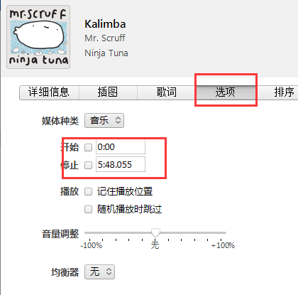 2、添加歌曲后,點擊右鍵,在彈出的窗口中點擊專輯信息-選項,然后我們選擇鈴聲開始的時間和停止的時間。選擇完成后點擊【確定】。注:長度控制在40s以內。