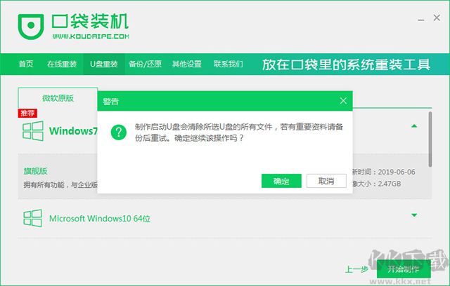 1、下載安裝口袋裝機(jī)程序,插入 U 盤后點(diǎn)擊 U 盤重裝系統(tǒng)。