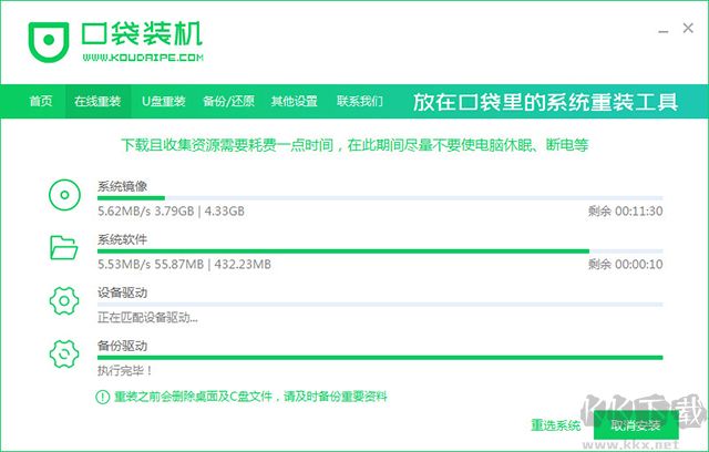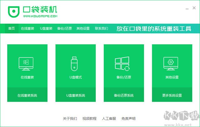 口袋裝機(jī)正版是一款非常好用的電腦重裝系統(tǒng)得力助手,功能全、操作簡(jiǎn)單。有在線和U盤重裝兩種模式,無論電腦能否開機(jī)都能快速重裝。界面簡(jiǎn)潔,在線重裝、U盤模式、備份 / 還原等功能一目了然。使用時(shí)按文字提示操作,電腦小白也能迅速上手重裝,擁有新系統(tǒng),感興趣或者有需要的小伙伴就快來kk網(wǎng)站下載體驗(yàn)一下吧。