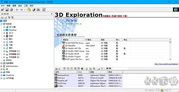 可觀看的3D文件包括3D Studio Binary(*.3ds)、3D Studio Project(*.prj)、 3D Studio ASCII(*.asc)、Caligari Objects&Dcenes(*.cob、*.scn)、 Light Wave Objects(*.lwo,*.lw)、 DirectX(*.x)、Autocad DXF(*.dxf)、 QuakeI Model(*.mdl)、QuakeII Model(*.md2)、Objec t File Format(*.off)、*.raw、*.obj等,平面圖型有bmp、rle、dib、gif、jpg、png、tif、tga、pcx 等,在觀看3D文件時可以用鼠標(biāo)調(diào)整不同的角度觀看。