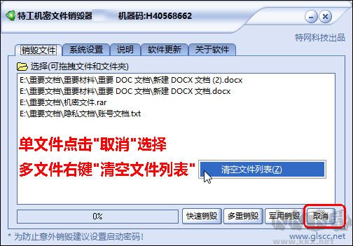 4、若列表中有文件不想銷毀,選中后點(diǎn)擊 “取消” 移除,右鍵 “清空文件列表” 可批量清除(非銷毀)。