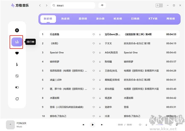 4、進(jìn)入排行榜,里面為玩家提供熱歌榜、原創(chuàng)榜、港臺榜、英美榜等等各大榜單;
