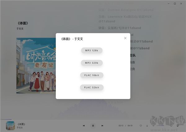 8、最后,進(jìn)入到播放頁面后,里面提供歌詞、封面、收藏、下載等功能,下載有多個(gè)音質(zhì)可選,有FLAC無損選項(xiàng),非常強(qiáng)。