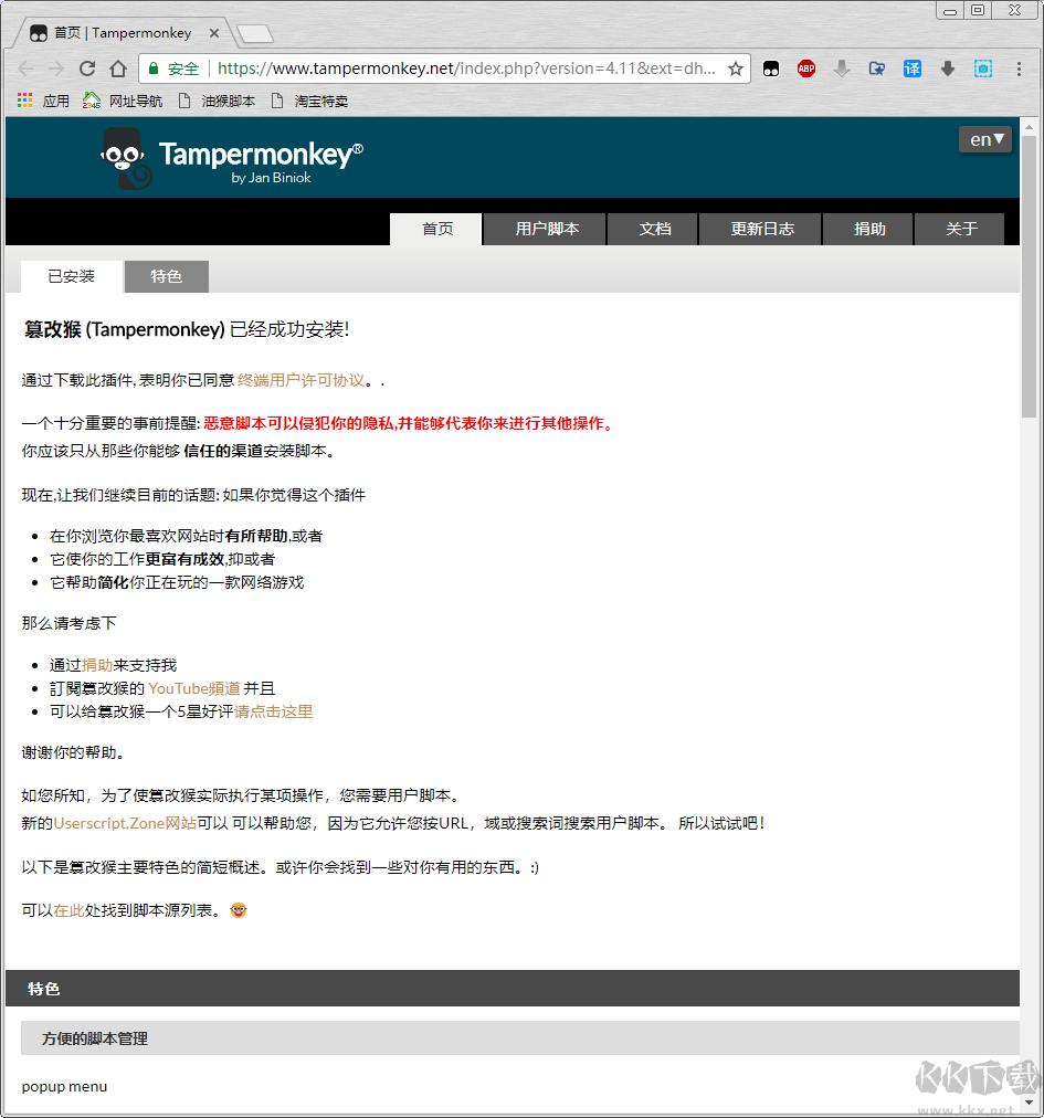 直觀展示所有已安裝腳本,包括最后更新時間、分類標(biāo)簽及腳本主頁鏈接,方便統(tǒng)一管理。