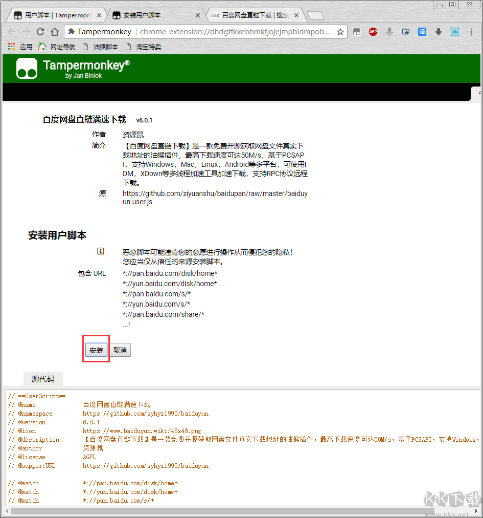 5、點擊安裝后會跳轉(zhuǎn)到該頁面,繼續(xù)點擊安裝即可正常使用腳本了。