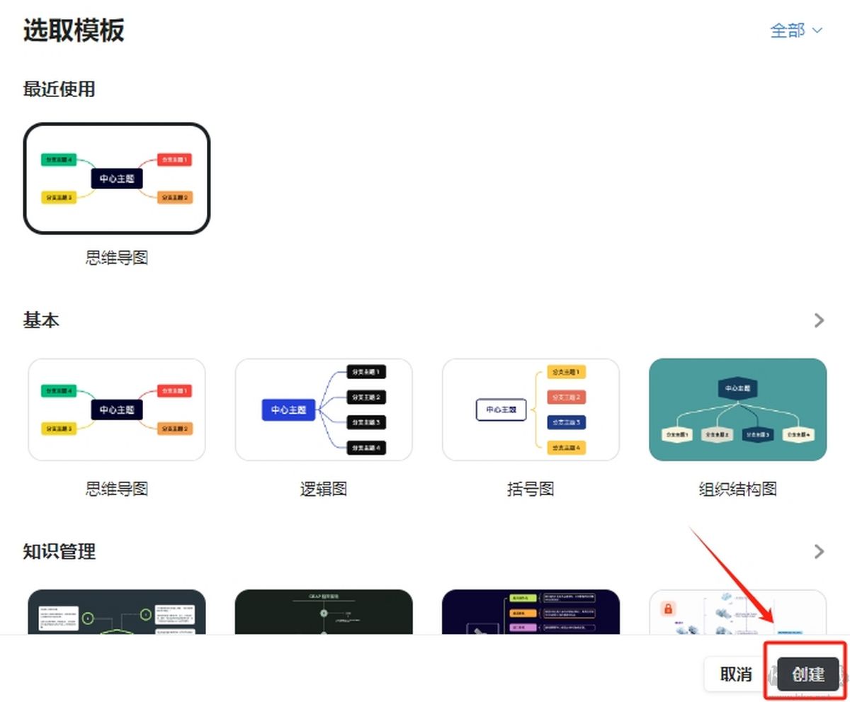 1.打開Xmind,選擇模板,點(diǎn)擊“創(chuàng)建”