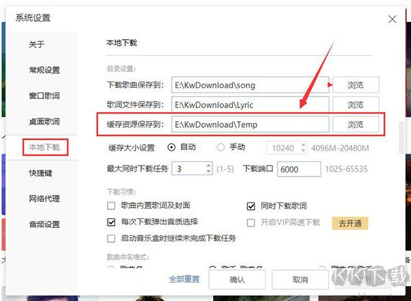 請在“主菜單”下拉列表下選擇“設(shè)置”,將“本地下載”中的“緩存資源保存路徑”修改為其他磁盤即可。