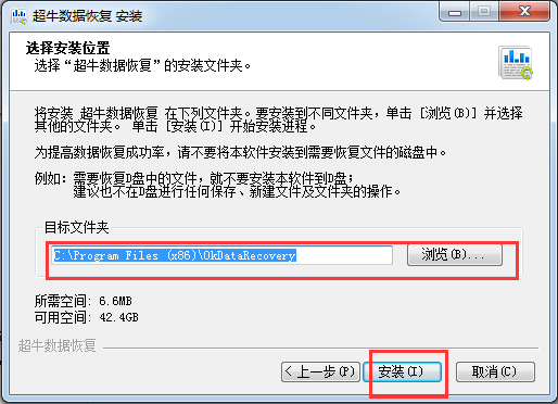 2.你可以默認(rèn)軟件安裝位置,將安裝超牛數(shù)據(jù)恢復(fù)在下列文件夾。安裝到不同文件夾,單擊瀏覽并選擇其他文件夾。