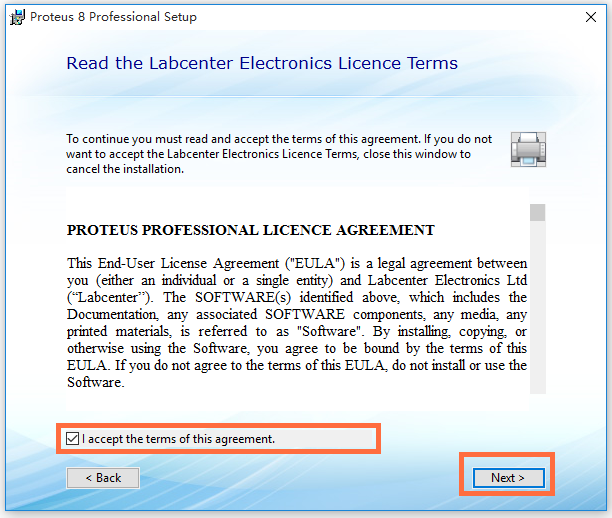 To continue you must read and accept the terms of this agreement. If you do not want to accept the Labcenter Electronics Licence Terms, close this window to cancel the installation.