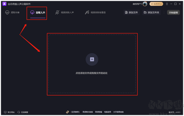 1、點(diǎn)擊“提取人聲”功能,同時點(diǎn)擊以下空白處添加歌曲文件。