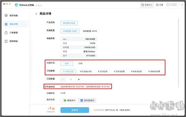 3、選擇合適的套餐訂閱,點(diǎn)擊去支付(注:購(gòu)買界面顯示當(dāng)前購(gòu)買云桌面可開啟時(shí)間,請(qǐng)?jiān)谟行趦?nèi)開啟使用)