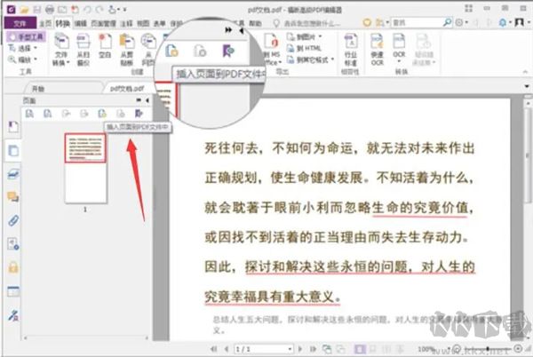 4、或者,你也可以點(diǎn)擊福昕高級(jí) PDF 編輯器菜單欄中的“頁(yè)面管理”,在其功能欄中點(diǎn)擊“插入”,再?gòu)?ldquo;插入”子菜單中選擇需要合并的 PDF 并進(jìn)行排列。