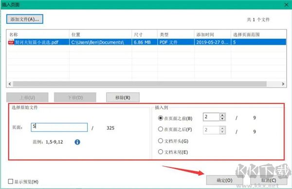 5、接下來(lái),在福昕高級(jí) PDF 編輯器彈出來(lái)的插入頁(yè)面的設(shè)置中,用戶(hù)設(shè)置需要合并的 PDF 具體的展現(xiàn)位置,設(shè)置完成后,點(diǎn)擊“確定”按鈕。