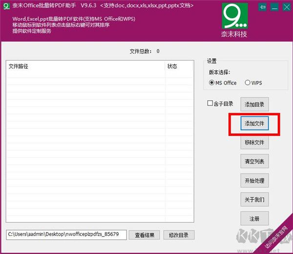 1、點(diǎn)擊底部“添加文件”,導(dǎo)入word或excel、powerpoint文件;或者直接拖入word、excel、powerpoint文件到軟件列表中。
