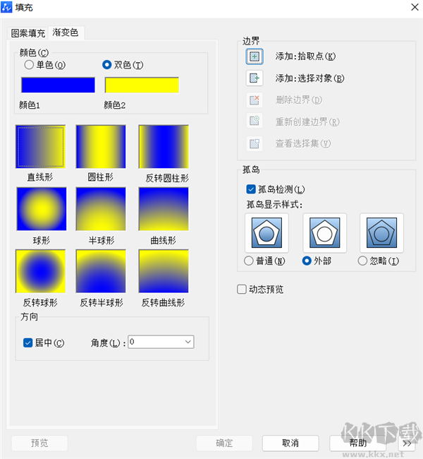 單色的填充可能不足以滿足大家對制圖的需要,此時可以使用漸變色進行填充讓圖紙更加精美。我們可以選擇單色或者雙色漸變,根據(jù)自身需要更換漸變的顏色。