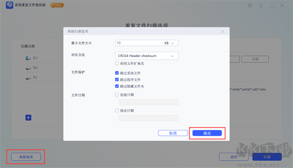 1)在彈出的頁面中,可以先點擊左下角「高級選項」進(jìn)行「高級掃描選項」設(shè)置并「確定」,方便更快速精準(zhǔn)找出自己想找的重復(fù)文件。