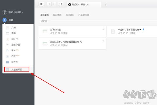 1、如果用戶想要直接新建簡歷,就可以點擊左邊的“新建”功能,由于“簡歷”模板并不是默認的模板,大家只需要點擊“從模板新建”選項即可開始制作,如下圖所示: