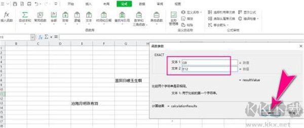 5、會(huì)彈出函數(shù)參數(shù)對(duì)話框,在文本1和文本2文本框中,分別填入所對(duì)應(yīng)的文本單元格的名稱,再點(diǎn)擊確定按鈕。