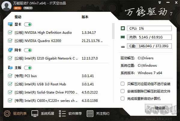 這是一個(gè)無(wú)需過(guò)多說(shuō)明的環(huán)境,萬(wàn)能驅(qū)動(dòng)7已經(jīng)被設(shè)計(jì)為一個(gè)按鈕解決驅(qū)動(dòng)問(wèn)題。萬(wàn)能驅(qū)動(dòng)7將自動(dòng)檢索所有硬件,并自動(dòng)給出最佳驅(qū)動(dòng)方案,只需要單擊“一鍵安裝”按鈕,稍事片刻后所有驅(qū)動(dòng)就會(huì)安裝完畢!