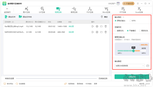 視頻壓縮方式主要分為速度優(yōu)先、平衡模式和畫質(zhì)優(yōu)先,根據(jù)自己的需要選擇即可。同時(shí)壓縮比例可以自由調(diào)整,數(shù)值越小,文件就越小,且圖像質(zhì)量也會(huì)較低;同時(shí)支持原格式輸出或?qū)⒁曨l轉(zhuǎn)為mp4格式。