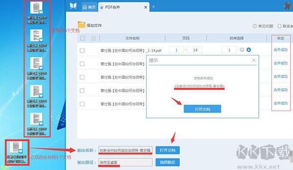 ④當(dāng)狀態(tài)欄顯示“合并成功”便可到所保存的路徑查看已合并的PDF文檔,根據(jù)輸出路徑查看桌面上已成功合并了1個文檔,需注意是如已修改過的文檔名稱才是成功合并的那一個文檔哦。