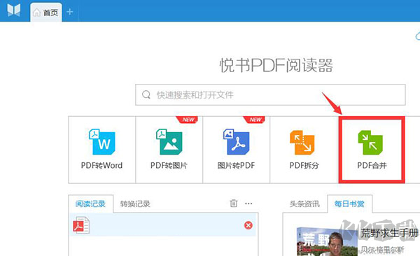 ①首先下載安裝最新版本“悅書PDF閱讀器”并打開軟件,即可看到首頁一欄“PDF合并”功能,單擊打開即可。