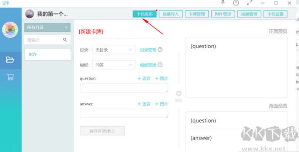 卡片的模板類型總共有4個(gè),我們這里選擇基礎(chǔ)卡牌;并分別在question處填寫上:BOY, 在answer處填寫上:男孩; 我們在右邊就會發(fā)現(xiàn)產(chǎn)生一個(gè)學(xué)習(xí)卡片,正面是:BOY,反面是對應(yīng)的答案:男孩。