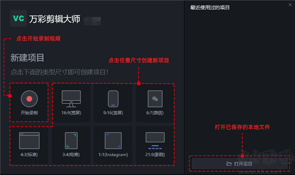 在該軟件中,創(chuàng)建項(xiàng)目的方式有三種:1、點(diǎn)擊開始錄制創(chuàng)建視頻項(xiàng)目,2、直接點(diǎn)擊任意尺寸新建項(xiàng)目,3、打開已保存的本地文件繼續(xù)編輯