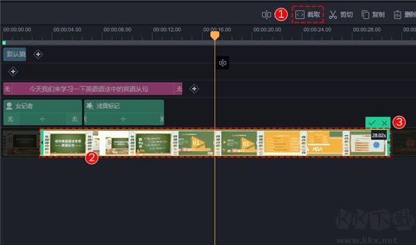 在時(shí)間軸中選中添加的視頻,然后點(diǎn)擊【截取】按鈕,可以通過左右兩側(cè)移動(dòng)截取視頻,也可以直接移動(dòng)截取區(qū)域進(jìn)行截取,最后點(diǎn)擊“√”保存截取設(shè)置